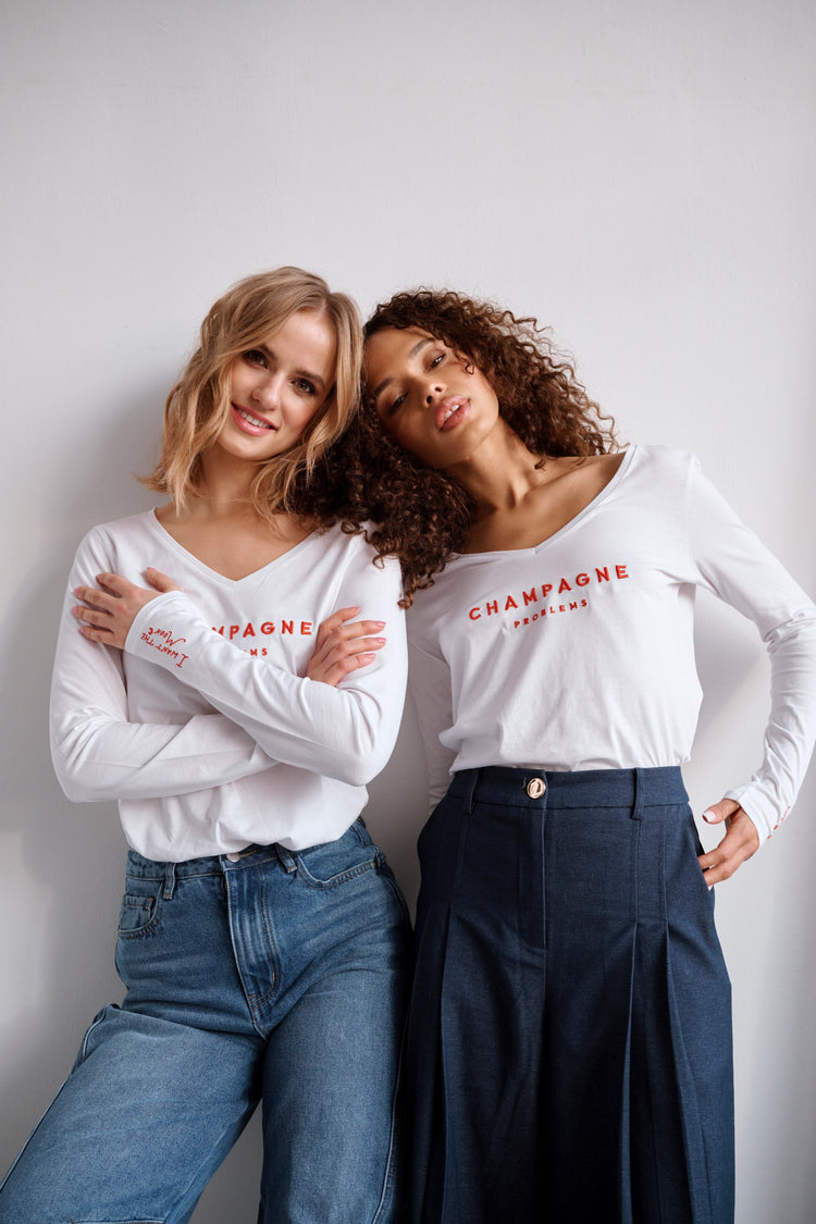 Details: • Linie: Luxury Line – Champagne Problems Capsule • Fit: Slim-Fit Longsleeve; Modell trägt Größe S • Farbe:Luna Glow White mit Moon Red Vollstick • Besonderheiten: Großflächige Stickerei „CHAMPAGNE PROBLEMS“ in Moon Red + femininer V-Ausschnitt, der das Dekolleté betont + Logo-Stickerei am Ärmel • Material: Single-Jersey aus Baumwolle & Elastan – weich, elastisch, körpernah • Hinweis zur Größe: Bei Zwischengrößen die größere Größe wählen